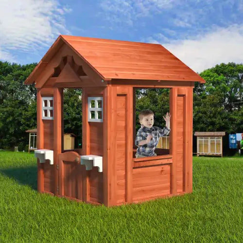 Product Name:Wooden Kids Playhouse with 2 windows and flowerpot holder,42"Lx46"Wx55"H,Golden Red